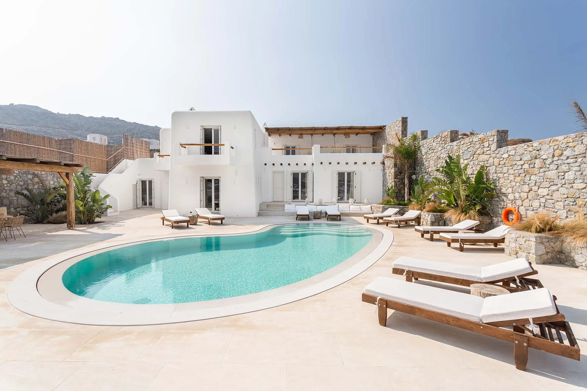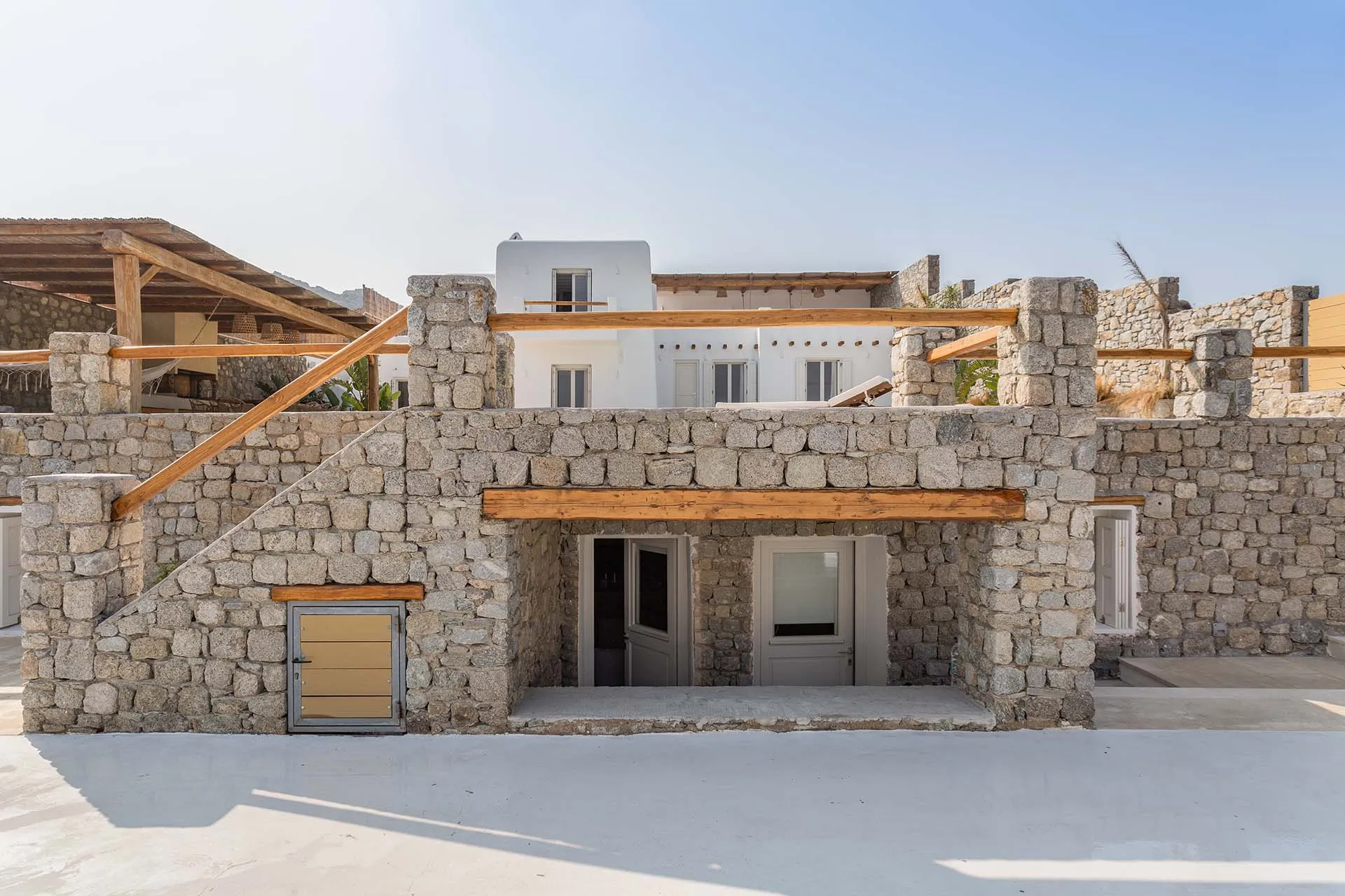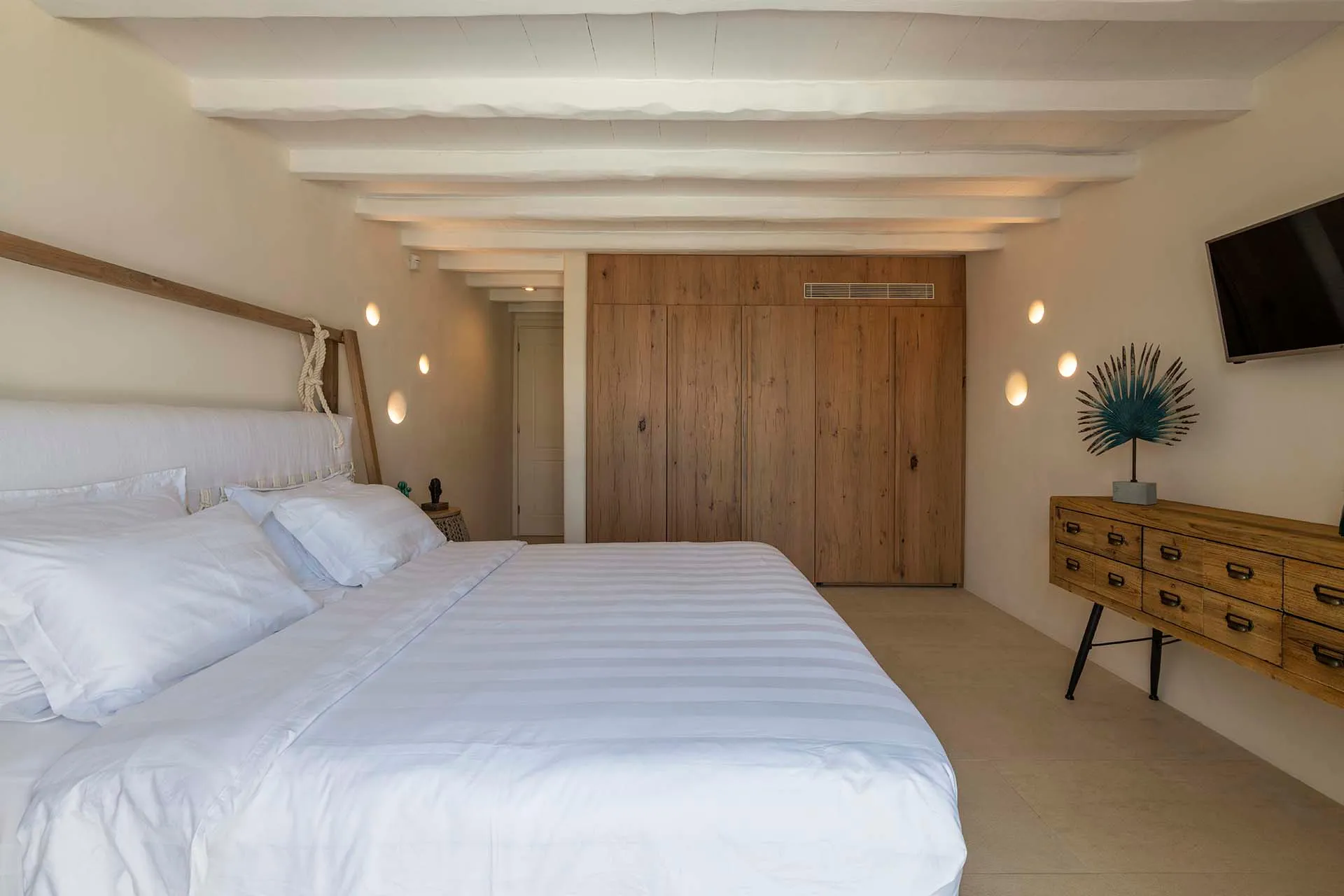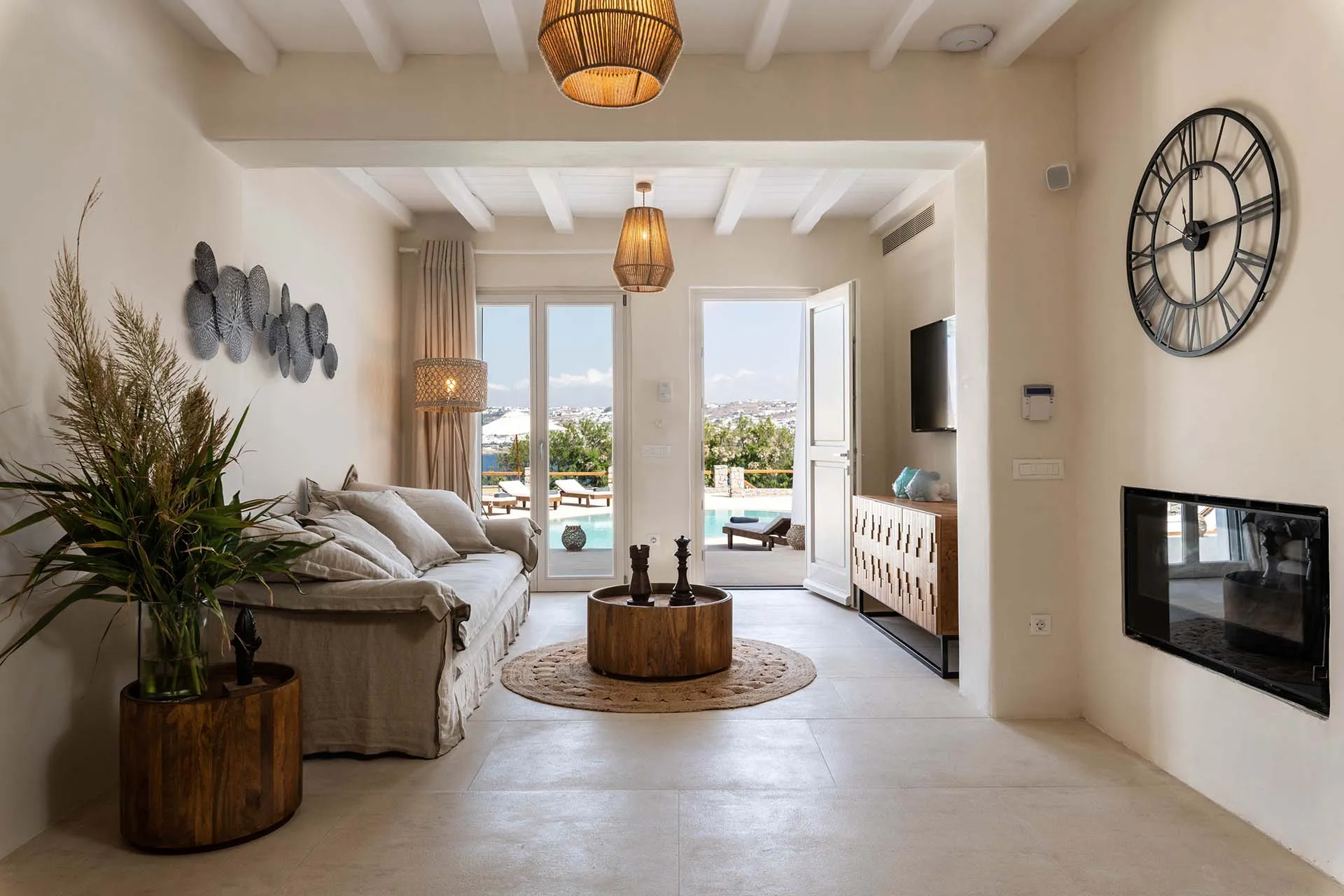 Audrey is a mere 5-minute drive from the sandy stretch of Ornos, a perfect beach for families with children, and roughly 10 minutes by car to the celebrity-favorite Psarou Beach, where you’ll eat and drink in style at Nammos bar-restaurant. Your luxury Mykonos villa can comfortably accommodate 14 guests, but if there are couples with kids amongst you, each of the independent guest houses offers a separate living area with a sofa bed, that can easily sleep 1+1 children.